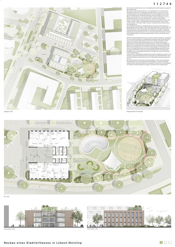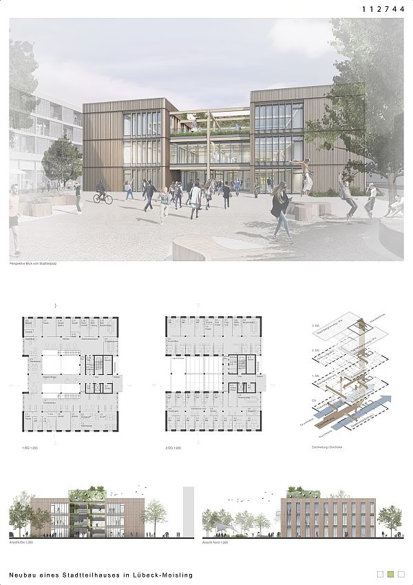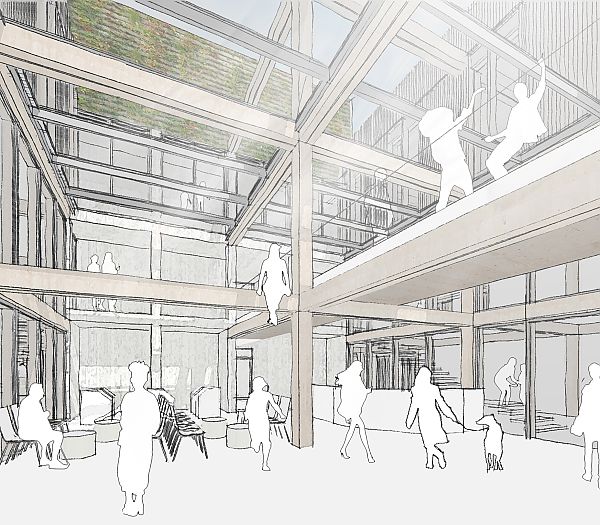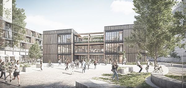 Der Entwurf bildet zum Stadtteilplatz hin eine klare Empfangsgeste, indem hier die Fassade zurückspringt und zusammen mit der Verbindungsbrücke im ersten Obergeschoss eine Eingangssituation schafft.