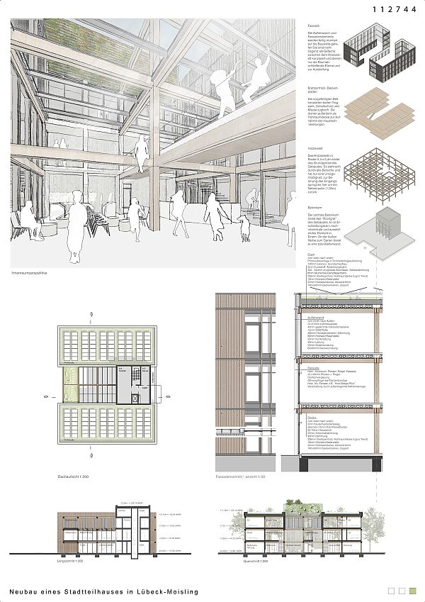 Der vorliegende Entwurf wurde konsequent als Holzbau geplant, welcher zu einem großen Teil im Werk vorgefertigt werden kann. Um den vorliegende Nutzungsanforderungen gerecht zu werden und das Gebäude auch für zukünftige Nutzungsänderungen zu wappnen, wurde ein Raster von 1,35m x 1,35m gewählt.