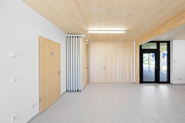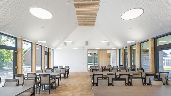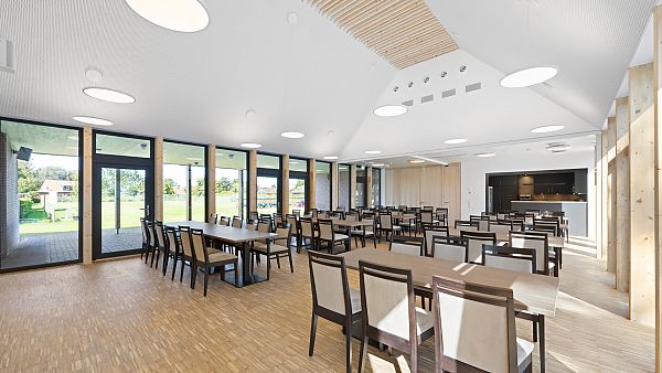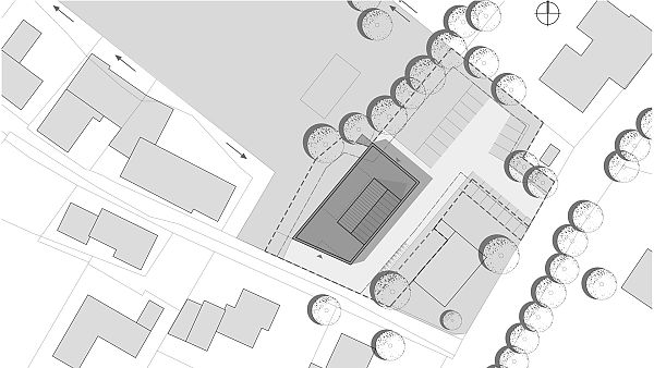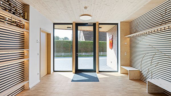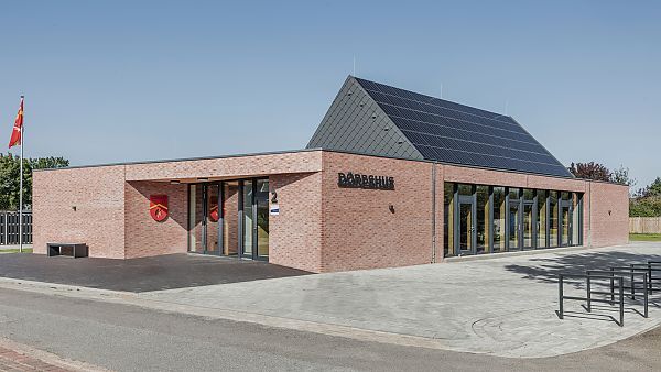 Der Entwurf des Gebäudes reiht sich in die Bebauung der Schulstraße ein, indem die Eingangsfassade die Flucht der Häuser und der Schulstraße aufnimmt. Das Dörpshus ist dagegen an dem Sportplatz ausgerichtet, sodass sich durch die Verschneidung dieser beiden Richtungen am Eingang eine ganz selbstverständliche Nische mit einem Vordach bildet. Der Saal bildet das zentrale Element, wird von zwei Seiten belichtet und bietet einen direkten Blick auf den Sportplatz. Es bildet sich eine große überdachte Terrasse innerhalb der Gebäudekubatur. In großen Teil mit einem Flachdach versehen, spannt sich nur über dem Saal ein geneigtes Dach, welches die erforderliche Raumhöhe, Luft und eine Reminiszenz an die umgebenden klassischen Einfamilienhäuser bietet.