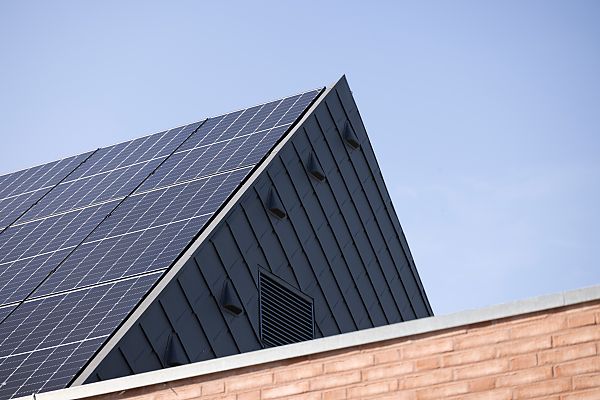 Das Haus versorgt sich selbst mit einer dachintegrierten Photovoltaikanlage mit Strom und wird nur durch eine Wärmepumpe beheizt.
